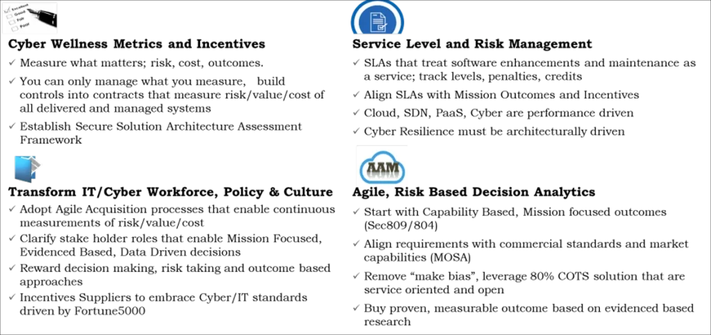 Actionable/measurable Solution Architectures must freeze requirements and measurable outcomes. With so many participants involved in an IT program, agency acquisition strategy must clarify roles and responsibilities of all participants, seeking to optimize contributions and buy in from the entire value chain. This includes “contracts” with users, overseers, CIOs, CMOs, CPOs, Congress, standards bodies, FFRDCs, non-profits, COTS/Open Source developers and Systems Integrators. Entry/Exit criteria must be established up front to set expectations and time lines.