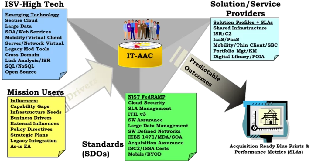 The IT-AAC and its membership offer the decision makers within White house, Congressional and Agency leadership, a conflict free structure, body of knowledge, expertise and analytical mechanisms needed to enable sound decisions on these critical issues, ensuring the improved effectiveness, timeliness and transparency of their estimated $177B investments in support of their critical missions. Partnered with 23 NGO/SDOs, IT-AAC offers Agency CxOs with direct access to our invaluable and already proven knowledge base, a key transformational resource for guiding digital transformations across the Federal landscape.